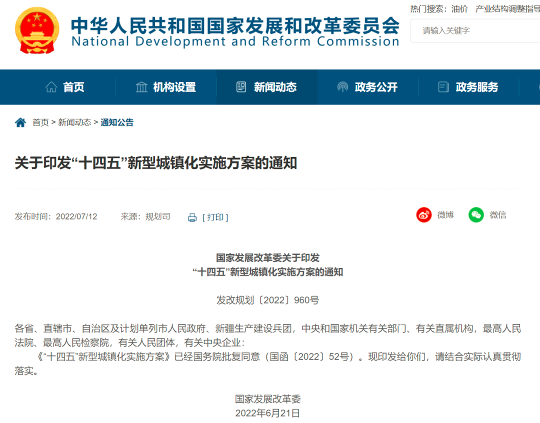 7月12日,国家发展改革委下发《“十四五”新型城镇化实施方案》,深入推进以人为核心的新型城镇化战略的目标任务和政策举措。